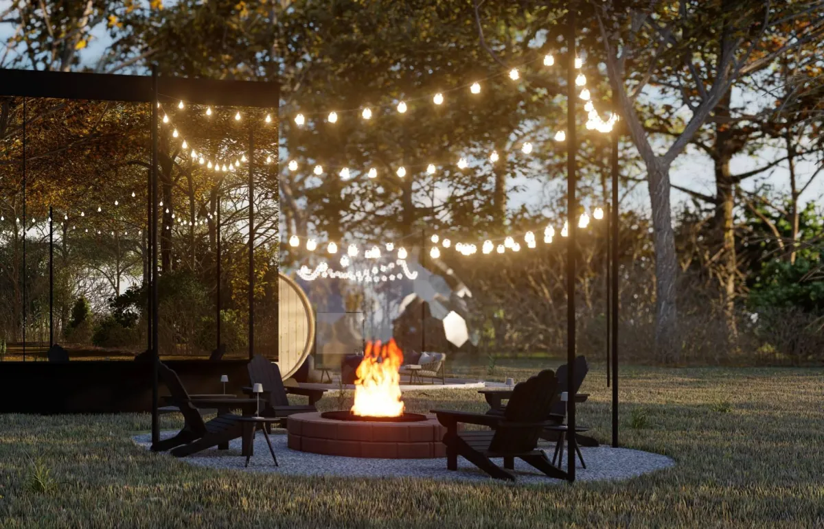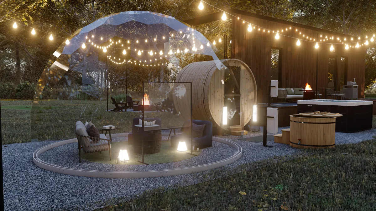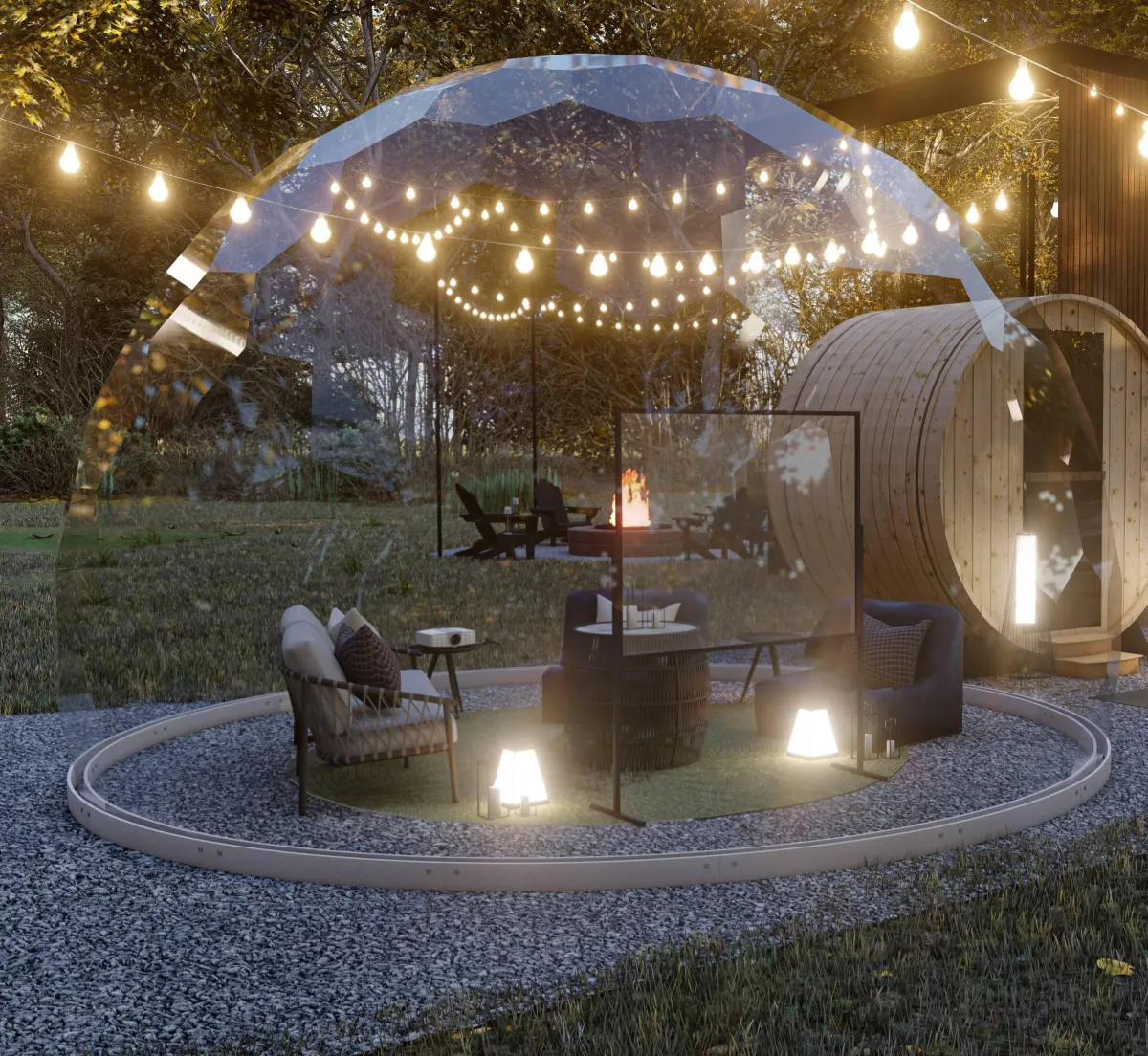 Our stunning clear dome is the perfect spot for outdoor hangouts with maximum comfort. Sip your favorite beverage under the stars, or use the projector screen setup to cuddle up for an outdoor movie.